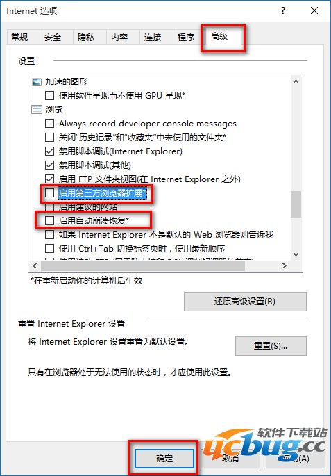 转换到“高級”菜单栏,在“设定”视图中往下翻转设定项,寻找“访问”地区的“开启第三方浏览器扩展”及其“开启全自动奔溃修复”选择项,撤销启用,明确关闭程序,重启电脑。